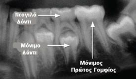 Τα πρώτα μόνιμα δόντια που ανατέλλουν στο στόμα ενός παιδιού είναι οι πρώτοι γομφίοι (τραπεζίτες) στην ηλικία των 6 ετών. Τα δόντια αυτά συνήθως δε γίνονται αντιληπτά από τους γονείς, γιατί εμφανίζονται πίσω από τα νεογιλά (παιδικά δόντια) χωρίς προηγουμένως να “πέσει” κάποιο παιδικό δόντι.