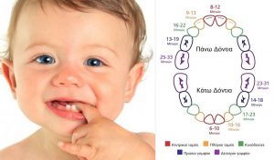 Κεντρικοί τομείς 6 – 10 μηνών Πλάγιοι τομείς 10– 16 μηνών Κυνόδοντες 17– 23 μηνών Πρώτοι γομφίοι 14 – 18 μηνών Δεύτεροι γομφίοι 23 – 31 μηνών