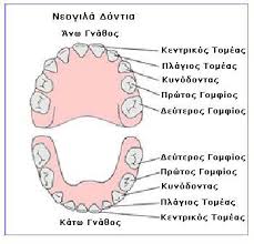 Η ανατολή των νεογιλών (παιδικών) δοντιών ολοκληρώνεται στην ηλικία των 2,5 – 3 ετών ανάλογα αν το παιδί “έβγαλε” γρήγορα ή αργά τα πρώτα του δοντάκια. Το σύνολο λοιπόν των πρώτων δοντιών του παιδιού είναι 20, δέκα σε κάθε γνάθο. Τα νεογιλά δόντια χωρίζονται στις παρακάτω κατηγορίες: