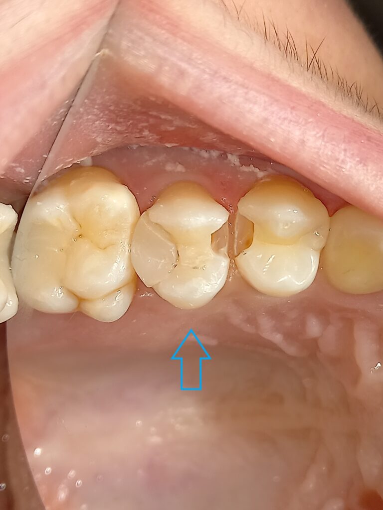 Η ασθενής είχε παλιό σπασμένο σφράγισμα ρητίνης στον άνω αριστερό δεύτερο προγόμφιο. Μετά την αφαίρεση του παλιού σφραγίσματος το δόντι προετοιμάστηκε καταλλήλως να δεχτεί ολοκεραμικό ένθετο. Ο λόγος που αποφασίστηκε να τοποθετηθεί ένθετο και όχι σφράγισμα ήταν οτι το οδοντικό έλλειμμα ήταν μεγάλο και ένα νέο σφράγισμα θα κατέληγε πάλι να σπάσει. Το δόντι απονευρώθηκε ( γιατί η τερηδόνα έφτανε στο ύψος του νεύρου του δοντιού), τροχίστηκε και λήφθηκε αποτύπωμα, το οποίο εστάλει στον οδοντοτεχνίτη για να κατασκευάσει το ένθετο.